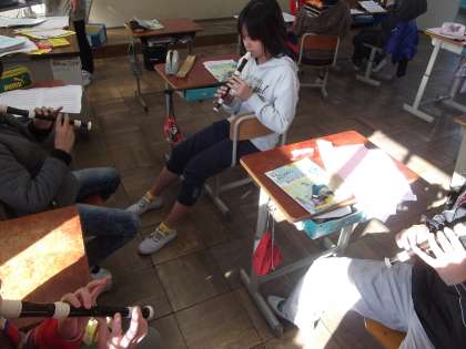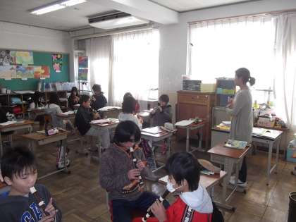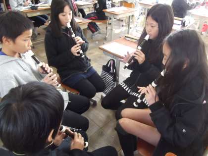 6年2組では,音楽の時間に学習した「パッヘルベルのカノン」のリコーダー演奏のテストをしていました。写真は,各グループ最後の練習をしているところです。