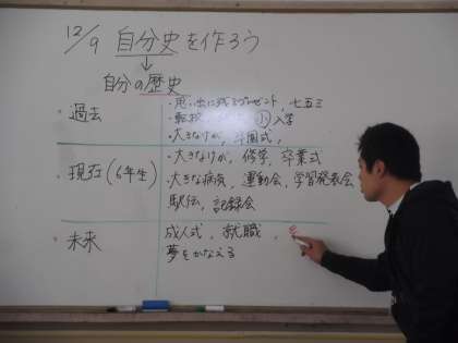 6年1組では,社会の時間に「自分史」づくりをしていました。今日は,みんなで「自分史」ついて話し合っていました。