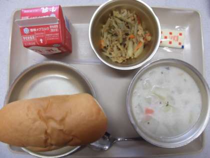 今日の給食の献立は,「コッペパン」「豆乳スープ」「ツナごぼうサンドの具」「マヨネーズ」「牛乳」新献立「豆乳スープ」・・・大豆から作られる豆乳を使った具だくさんのスープです。じっくり煮こんだ野菜のあま味やベーコンのうま味と豆乳のまろやかな味がとけ合っておいしいですよ。
