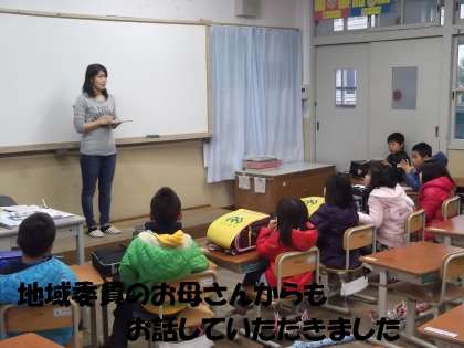 地域委員のお母さんも参加され,子どもたちに自転車の安全な乗り方についてお話していただきました。ありがとうございました。