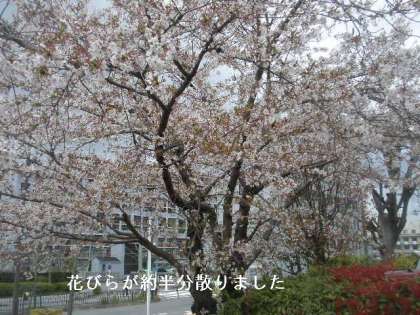 学校の桜も散り始めました。満開時の約半分程度,花びらが散りました。来週末には葉桜になるのではないでしょうか?でも,中庭のチューリップは今が満開です。色とりどりの花を咲かせています。