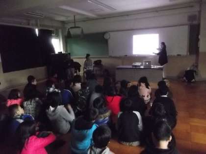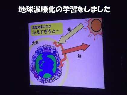 京都市環境政策局地球温暖化対策室などと連携して,こども向けの環境学習の出前授業をしていただいている,特定非営利活動法人「気候ネットワーク」の方に来ていただき,地球温暖化問題について教えていただきました。