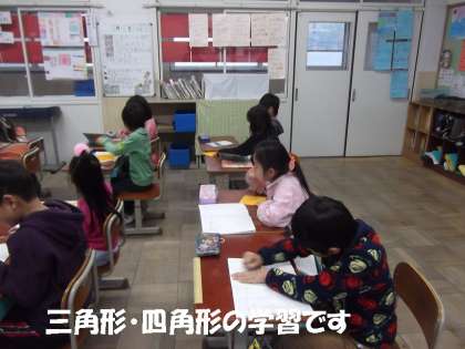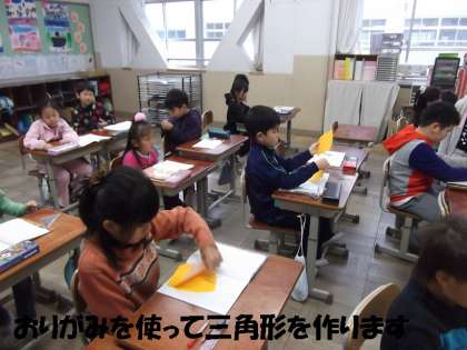 算数で「三角形・四角形」の学習をしています。今日は,おりがみを折って形作りに挑戦しました。