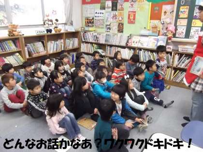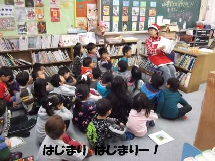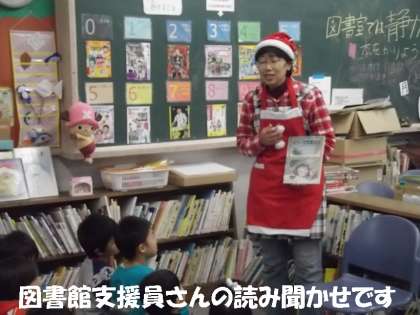 今日は,図書館支援員の藤田先生に読み聞かせをしていただきました。サンタさんの姿で,いったいどんな本を読んでもらったのかな??