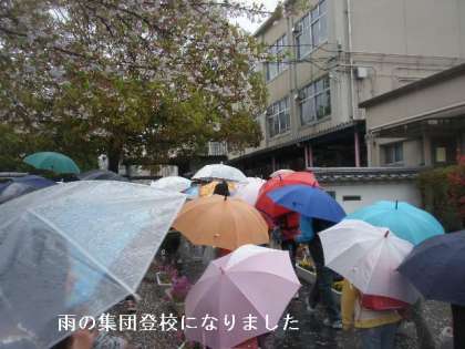 朝から雨が降っていて,カサをさしての集団登校になりました。でも子どもたちは元気にあいさつをして登校しました。先週から青色パトカーが子どもたちの集団登校の様子を巡回してくださっています。