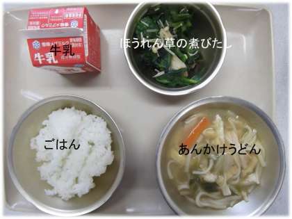 「ごはん」「あんかけうどん」「ほうれん草の煮びたし」「牛乳」
