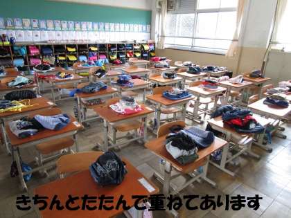 子どもたちが体育で運動場に出ている間,教室をのぞいてみると,全員きちんと服やズボンをたたんで重ねておいてありました。整然と並んでいると気持ちいいものですね。1年生の子どもたちの力はすごいです。
