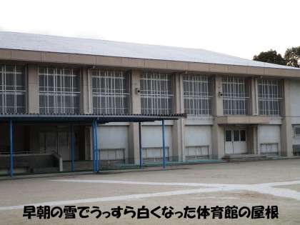 早朝に雪が降り,体育館の屋根が白くなっていました。