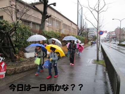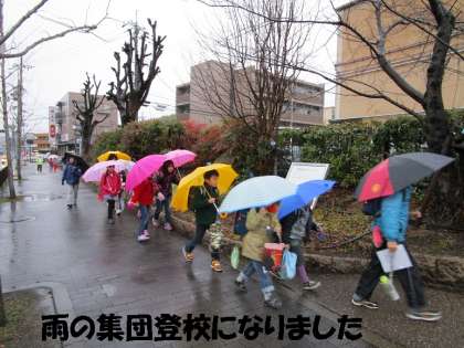 今日は雨になりました。集団登校時には少しきつく降っていましたので,さすがに全員かさをさしての登校になりました。