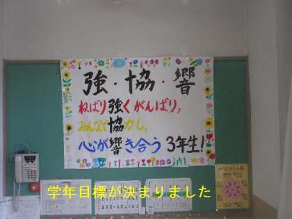 3年生の学年目標が決まり,教室に貼り出されました。目標達成のため,毎日朝の会などに大きな声で復唱することが大事ですね。がんばりましょう。