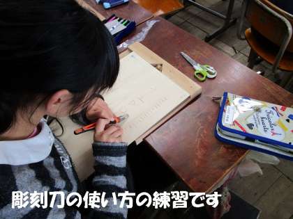 図工は,初めて彫刻刀を使いますので,まずは彫り方(使い方)の練習です。