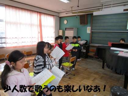 音楽では,テンポの速いリズミカルな曲を少人数で歌いました。人数が少ないので,一人一人がしっかり声を出さないとピアノ伴奏に負けてしまいます。