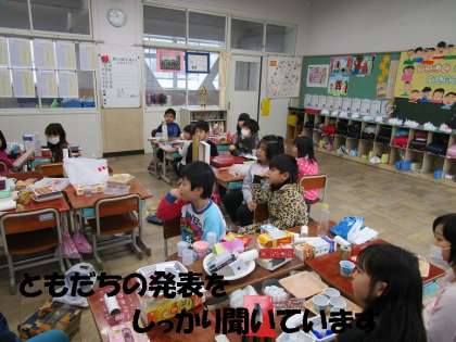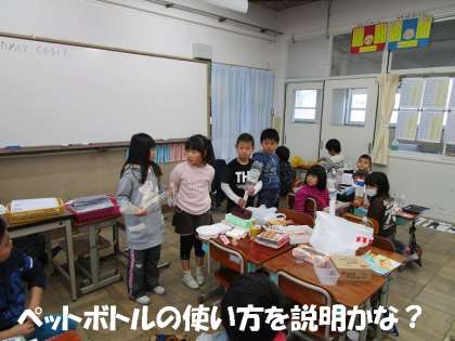 生活科で,家からペットボトルや空箱などを持ち寄って,音を出したり何か作ったり,子どもたちが工夫して遊びを考える楽しい学習をしています。