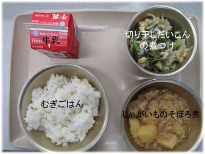 「切り干しだいこんの煮つけ」「牛乳」