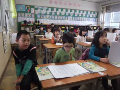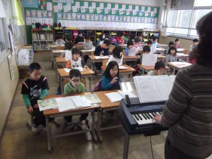 3組では,音楽の学習時間に1年生と交流学習を行いました。1年生と一緒に上手に歌を歌うことが出来ました。