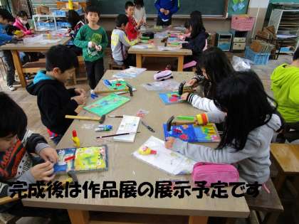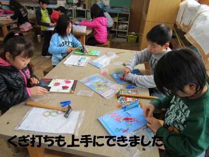 図工の時間に「コリントゲーム」を作っています。土台に自分の好きな絵を描き,上からくぎを打って完成します。出来上がったらビー玉をころがして遊びます。