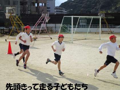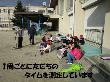 3年生が運動場でしっぽ取りをしている中,外周を使って2000mのペースをしました。スタートして,1〜2周はどうしてもペースが速くなってしまいます。