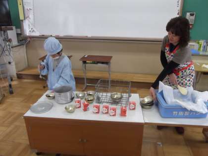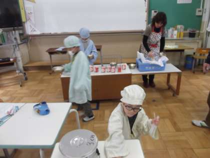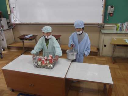 写真は,給食の準備の様子です。みんなで協力して給食の準備をしています。