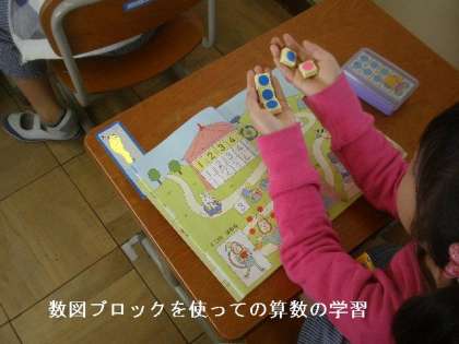「5つの数図ブロックを2つと3つに分けましょう」「1つと4つに分けられるかな?」と先生の問いかけに,すばやく反応して数図ブロックを分けています。今日は全員合格でした。