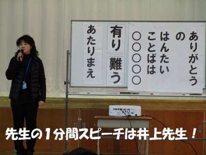 みっきーわくわく集会のはじまりは,先生の1分間スピーチです。今日は,3組担任の井上先生のお話でした。