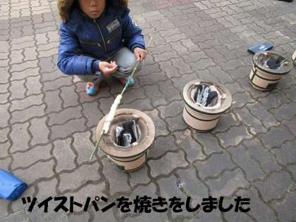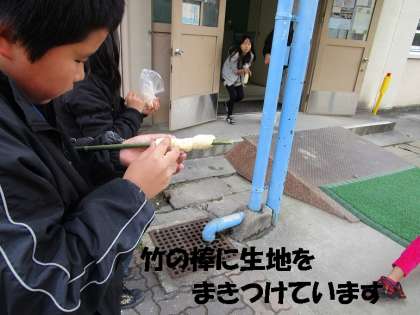 2/9(月)には,野外で「ツイストパン作り」に挑戦していました。みんなで生地を作り,それを竹の棒に巻きつけて炭で焼きます。