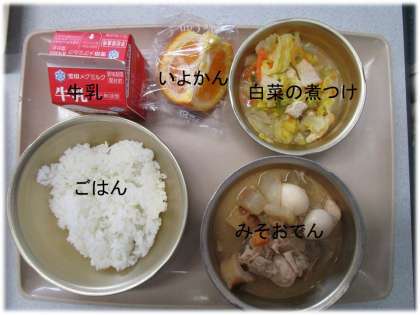 「ごはん」「みそおでん」「白菜の煮つけ」「いよかん」「牛乳」