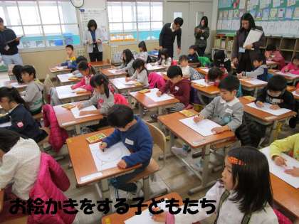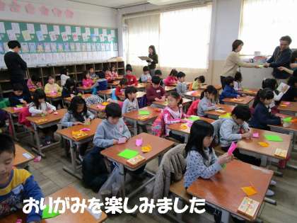 元気な35名(2名インフルエンザ等で欠席)の子どもたちが,1年生の教室でお絵かきしたりおりがみを折ったりして楽しい半日入学を体験しました。