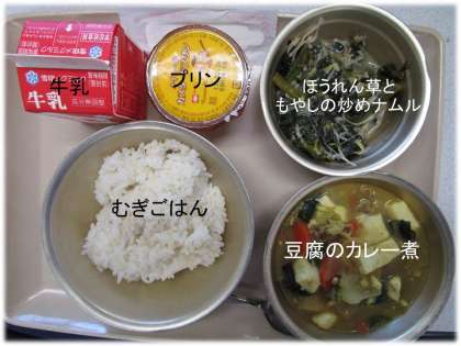 「むぎごはん」「豆腐のカレー煮」「ほうれん草ともやしの炒めナムル」「牛乳」