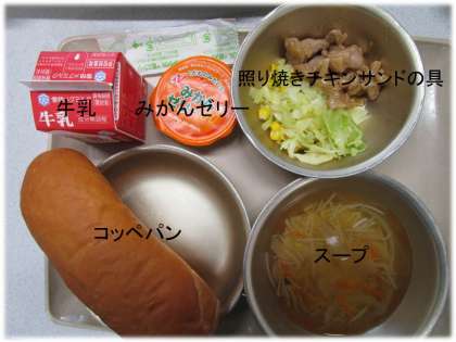 「コッペパン」「スープ」「照り焼きチキンサンドの具」「牛乳」