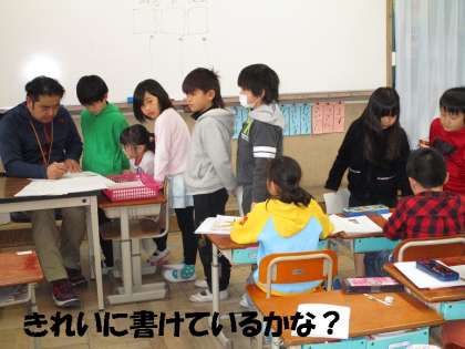 1組では,国語「スーホの白い馬」の学習で,先生が一人一人のノートをチェックしていました。