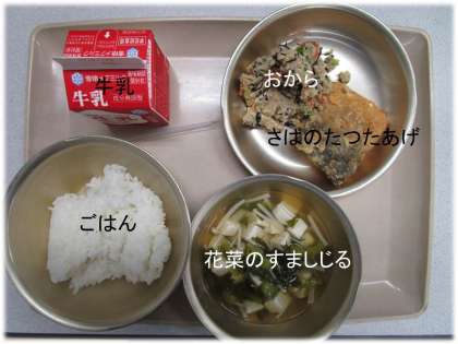「ごはん」「花菜のすましじる」「さばのたつたあげ」「おから」「牛乳」