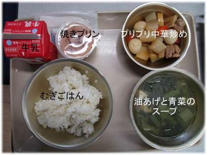 「むぎごはん」「油あげと青菜のスープ」「プリプリ中華炒め」「牛乳」