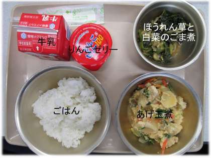 「ごはん」「あげ玉煮」「ほうれん草と白菜のごま煮」「りんごゼリー」「牛乳」