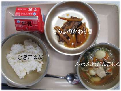 「むぎごはん」「ふわふわだんごじる」「さんまのかわり煮」「牛乳」