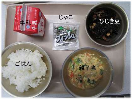 「ごはん」「親子煮」「ひじき豆」「じゃこ」「牛乳」