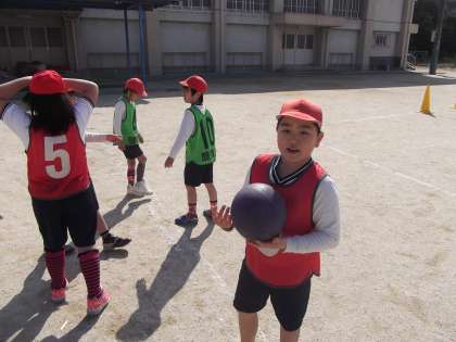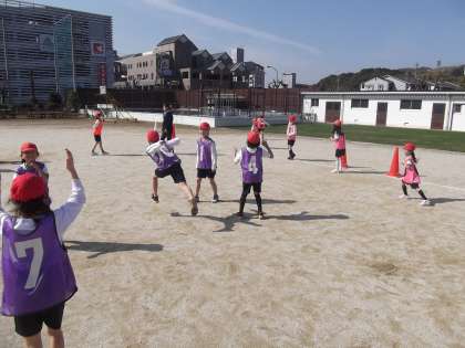 体育の時間に「サッカー」の試合をしていました。グループで作戦を立てて試合に臨みました。作戦通りに試合はできたかな