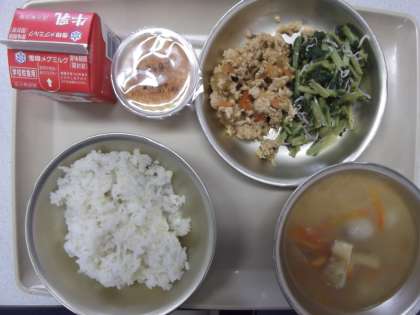 今日の給食の献立は,「むぎごはん」「いものこじる」「大根葉とじゃこのいためもの」「とりそぼろ丼」「牛乳」「やきプリン」です。