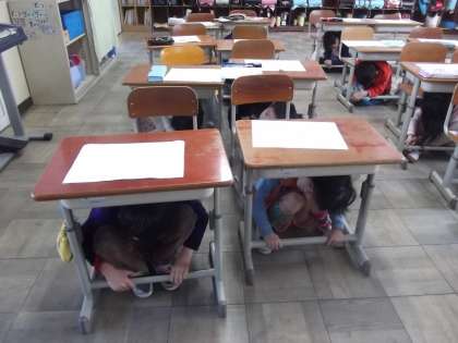 午前9時30分に京都市(本校も実施)では,シェイクアウト訓練(京都市防災一斉行動訓練)を行います。子ども達は,身の安全を守る行動(3つの安全行動「姿勢を低く」「体頭を守って」「揺れが収まるまでじっとして」を1分間おこなう。)を行うことかできました。この機会に災害時の避難についてご家庭でも話し合ってください。