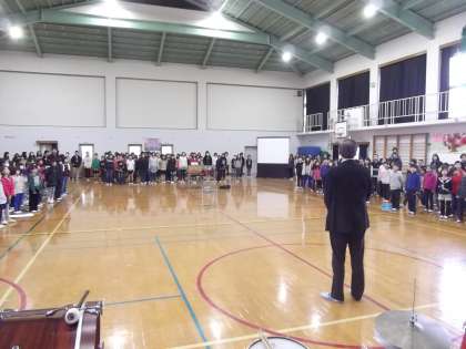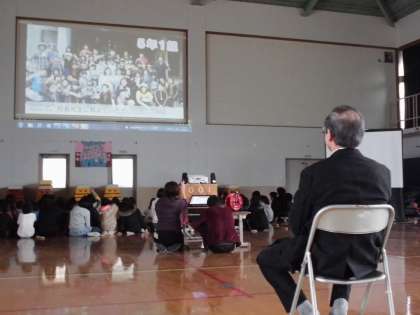 「校長先生を送る会」では,はじめに全クラスの子ども達より,校長先生への「感謝の言葉」がスライドで流れました。次は,みんなで校歌を歌いました。