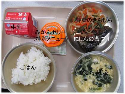 「ごはん」「かきたまじる」「にしんの煮つけ」「野菜のきんぴら」「牛乳」「みかんゼリー(特別メニュー)