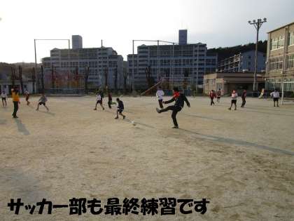 サッカー部も最後の練習です。卒業生(中1)もやってきて,先生と中学生も交じって何試合も試合をしていました。