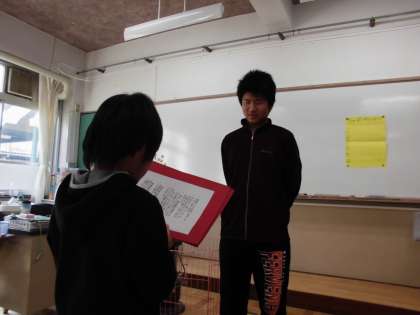 卒業を迎える6年生のためにお祝い会を行いました。午後からは保護者の方も参加いただきました。たこあげやカードゲームでレクリエーションを楽しんだあと,在校生代表として5年生が「部活動の卓球ではサーブを教えてくれてありがとうございました。これからはクラスを引っ張っていきます」と送る言葉を伝えました。その後,1年生・3年生から手作りのプレゼントとして小物入れを渡しました。最後に,6年生から一人ひとりへのメッセージと担任そしてお母さんへの思いを伝えました。参加者から大きな拍手を送りました。そのあと,交流クラスである6年2組のみんなからサプライズで手作りのケーキが届きました。卒業まであと7日。いい思い出ができました。