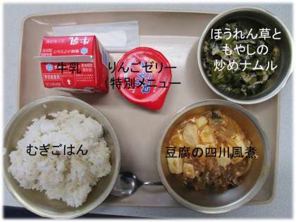 「むぎごはん」「豆腐の四川風煮」「ほうれん草ともやしの炒めナムル」