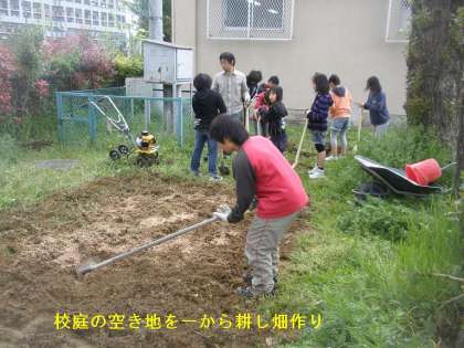 最初の予定より,多くの種類の野菜を作ることになったため,従来の畑では足りず,運動場西側の校庭(空き地)に畑を作っています。