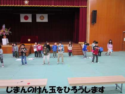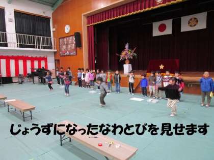 大きな声で入学おめでとうのことばを発表して,自慢のなわとびやけん玉を新1年生の前で披露します。