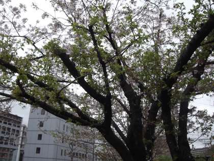 連日の雨で正門前にある桜が満開時の半分ぐらいになってしまいました。少し残念です。