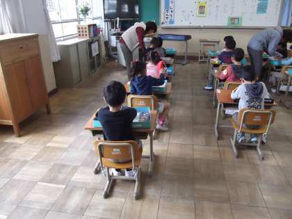写真の様子は,学活で子ども達のお道具箱の整理の仕方を教えてもらっています。