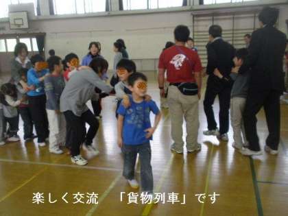 新しく1年生をむかえての,初めての交流学習です。自己紹介からはじまり,ジャンケンゲームや子どもたちの大好きな「貨物列車」などをして仲良くなりました。