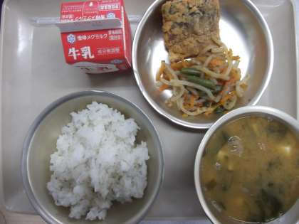 今日の給食の献立は,「むぎごはん」「みそ汁」「野菜のきんぴら」「さばの竜田揚げ」「牛乳」です。