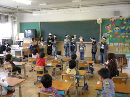 今日は朝から1年生の教室に行って、お兄さん、お姉さんらしく、日頃の音読学習の一つとして読み聞かせ(音読発表会)をしました。
